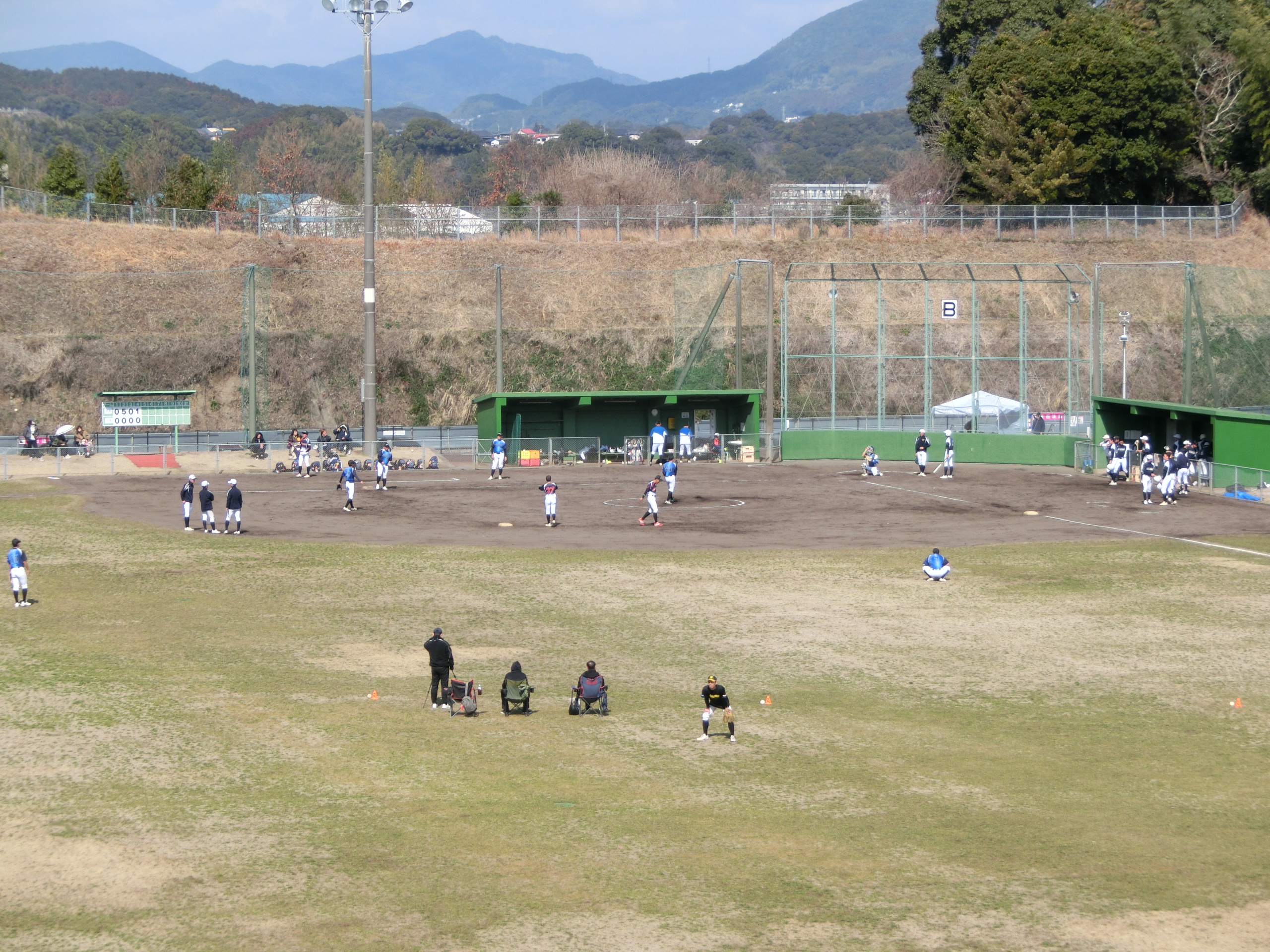 ソフトボール場では高校生の強化練習試合と審判員講習会が行われています。