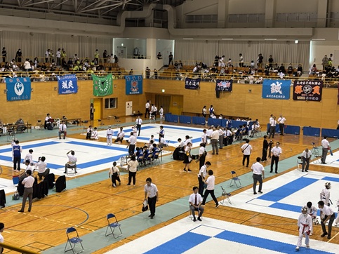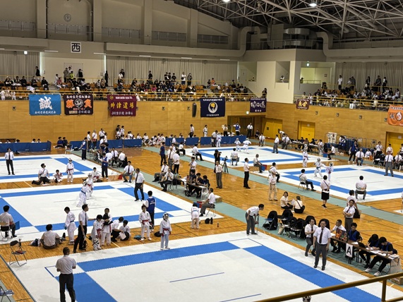 各空手団体の応援旗もアリーナ観客席に飾られ保護者も声の限り応援しています。
