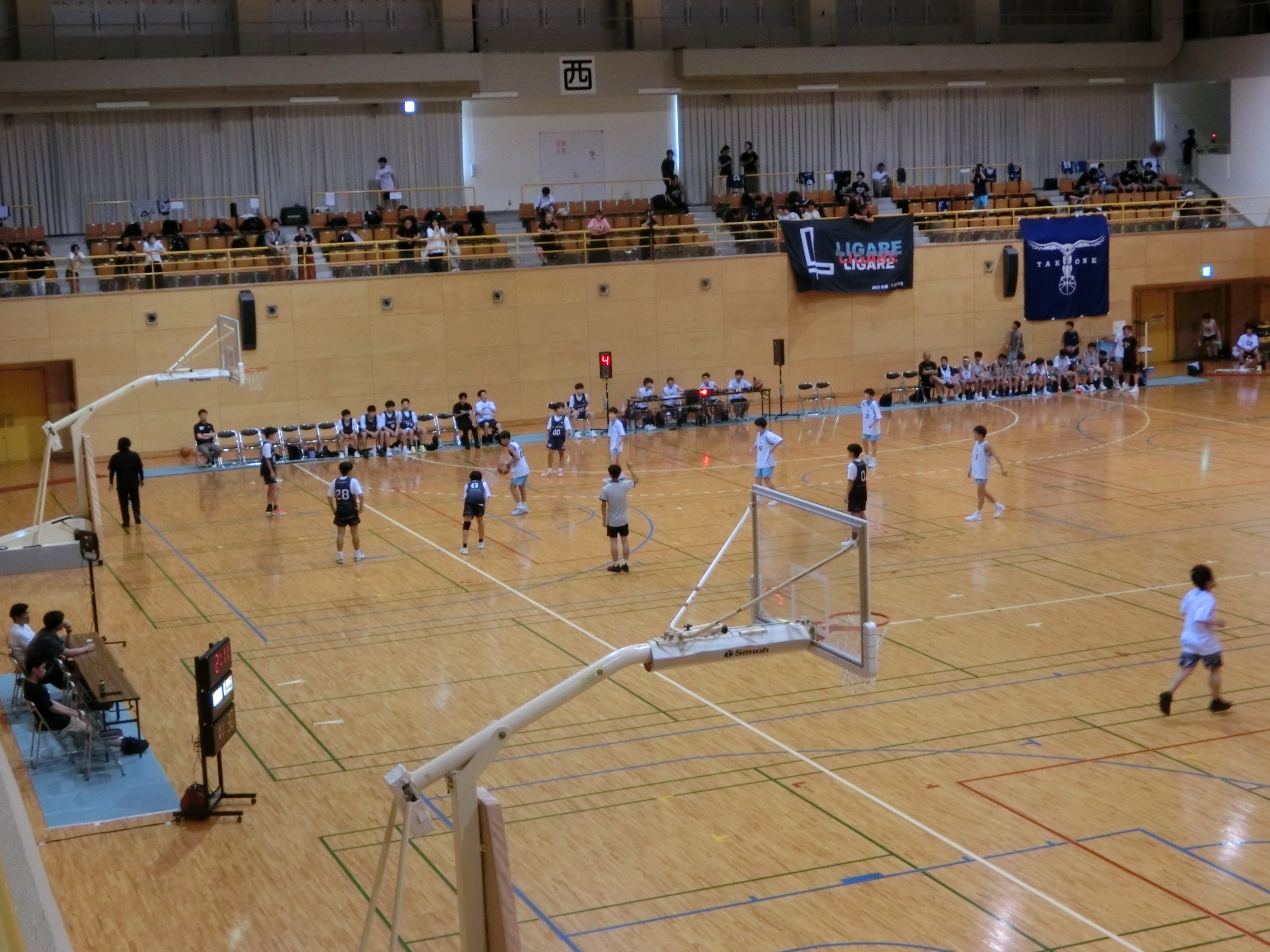 体育館はバスケット大会の2日目となっています。今日は22チームが全24試合を行います。